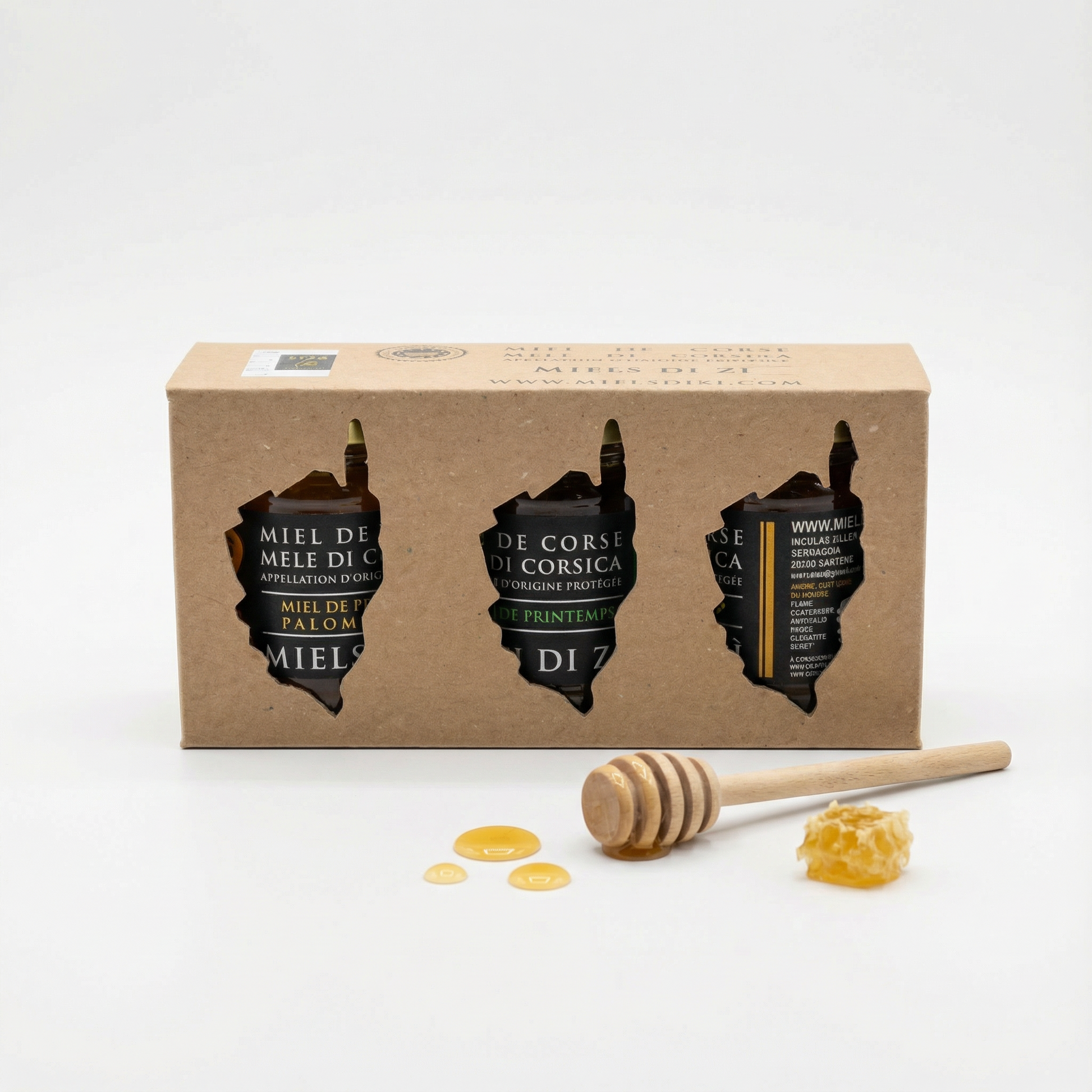 Coffrets 3 miels — un miel corse signé Miel di Zi, sélectionné pour sa texture et son goût. À tartiner, à cuisiner ou à offrir.
