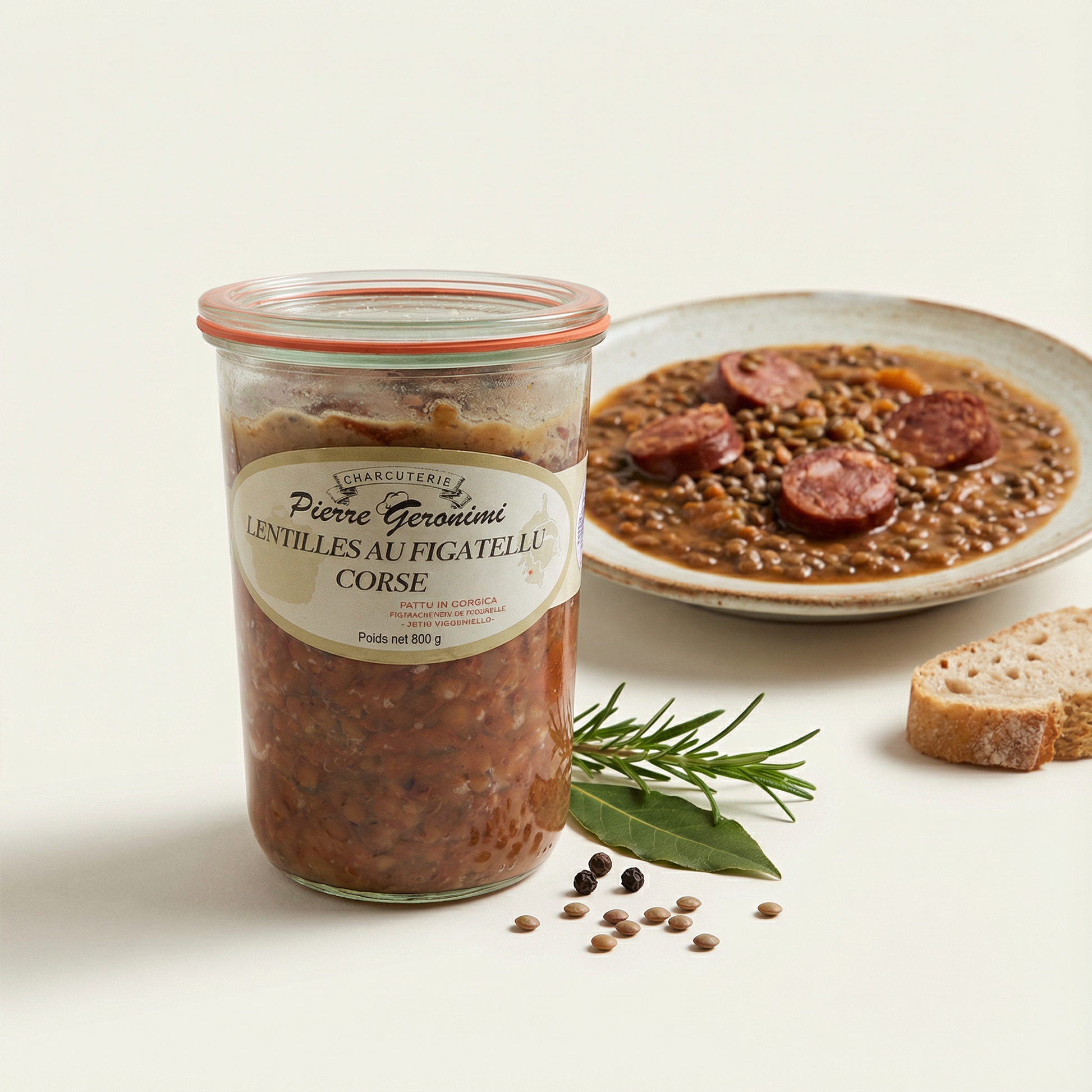 Lentilles au Figatelli issu de notre sélection d'épicerie salée corse, préparé avec soin par Pierre Géronimi. Recette généreuse du terroir corse, ces lentilles sont mijotées avec du figatelli pour offrir un plat savoureux, aux notes fumées et authentiques.